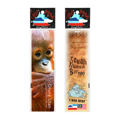 A photo of a juvenile orang utan playing with his fingers. The photo shows both sides of this bookmark. The Sabah Map, Malaysia Flag, and Sabah Flag are all printed on the back side.